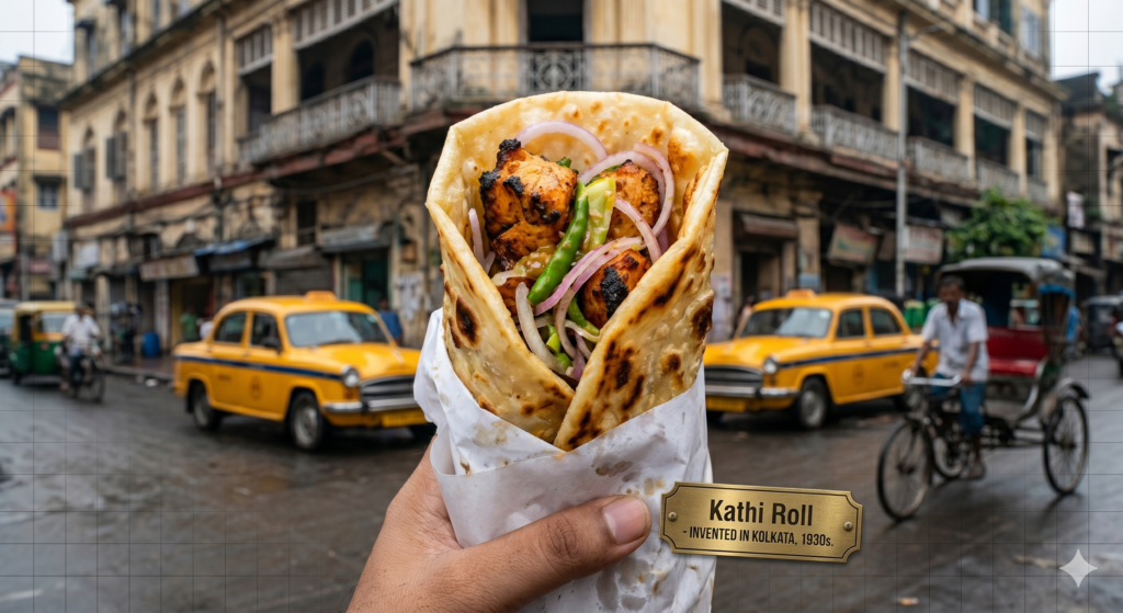 Did you know the Kathi Roll was invented in Kolkata? Yes, this globally beloved street food originated right here in the City of Joy. A Kathi Roll is a flaky, paratha-like flatbread wrapped around juicy skewered meat — typically chicken or mutton kebab — along with sliced onions, green chillies, and a generous drizzle of lime juice and green chutney. Paneer versions are equally popular for vegetarians.