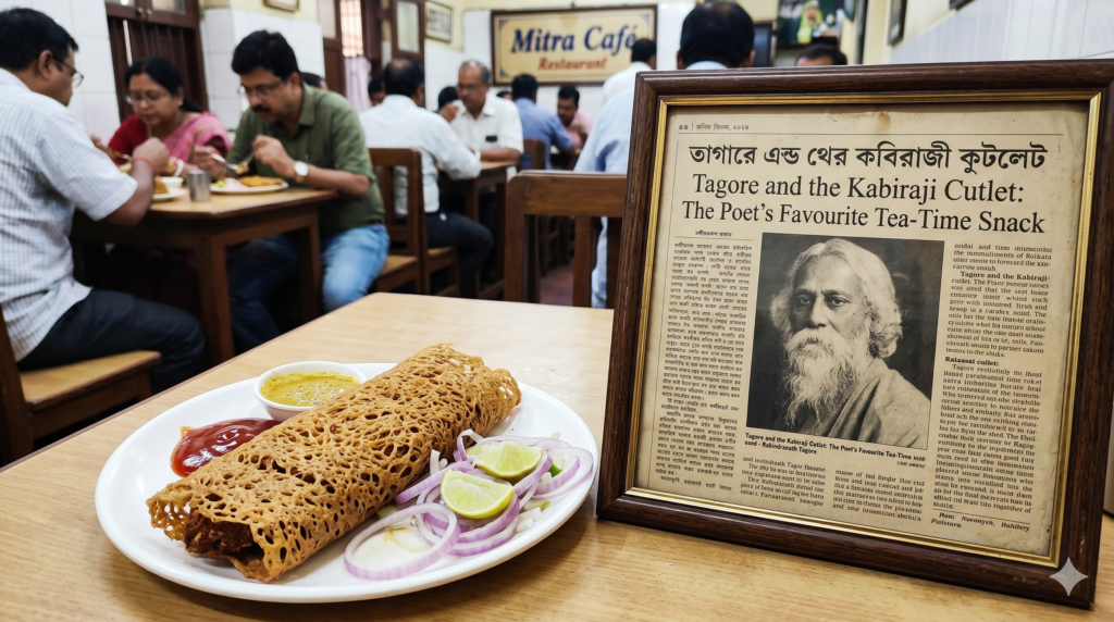 The Kabiraji Cutlet has one of the most fascinating origin stories in Indian culinary history. Legend has it that Rabindranath Tagore once expressed his dislike for breadcrumb-coated cutlets, and a talented chef at Basanta Cabin on College Street responded by creating a cutlet wrapped in a delicate, lacy egg-net — fried to crispy perfection. Tagore loved it, and the Kabiraji Cutlet was born.