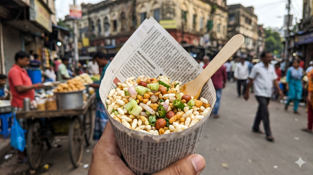 Jhal Muri is the everyday snack of Kolkata — you’ll find vendors selling it on every street corner, at every park, and near every railway station. “Jhal” means spicy, and “muri” means puffed rice. This deceptively simple snack combines puffed rice with fried dal, roasted peanuts, chopped onions, tomatoes, green chillies, coriander, sev (crispy noodles), a dash of mustard oil, and tangy tamarind chutney — all tossed together in a metal bowl and served in a paper cone or newspaper bag.